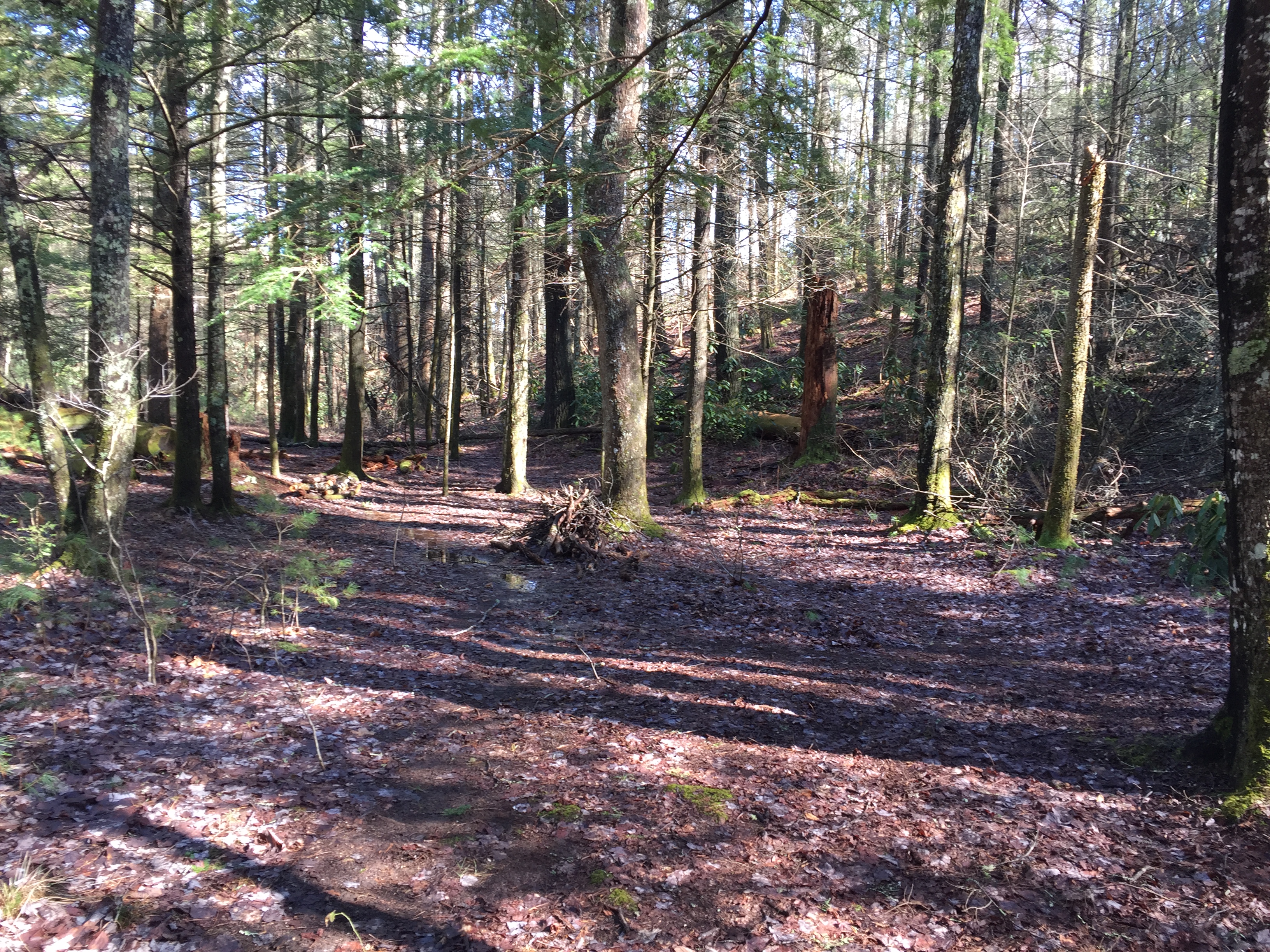 The trailhead is on the Park Boundary where Rich Mountain Road meets Old Cades Cove Road, leading to Townsend. In general it is a pleasant saunter through white pines. The climbs are sudden but mercifully short and serve to raise the heart rate for a good physical workout. I began this trek a little after the noon hour immediately following my hike up and down Rich Mountain Trail. At about 2.3 miles, the trail passes through Kelly Gap with the remnants of Campsite #4, which is a pleasant spot for camping, although it is absent the typical fire rings and bear cables. A water source is a few yards behind in a small stream. However there is a rather large house visible a hundred yards or so beyond.