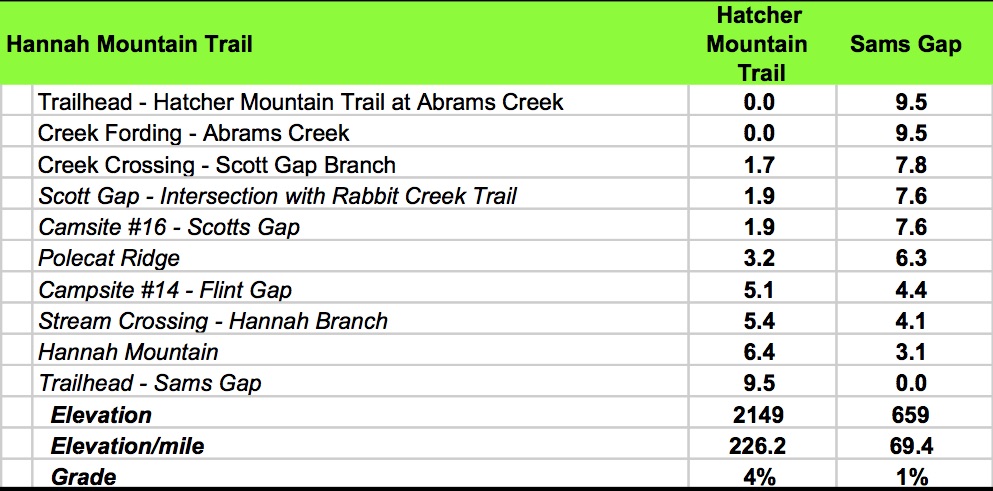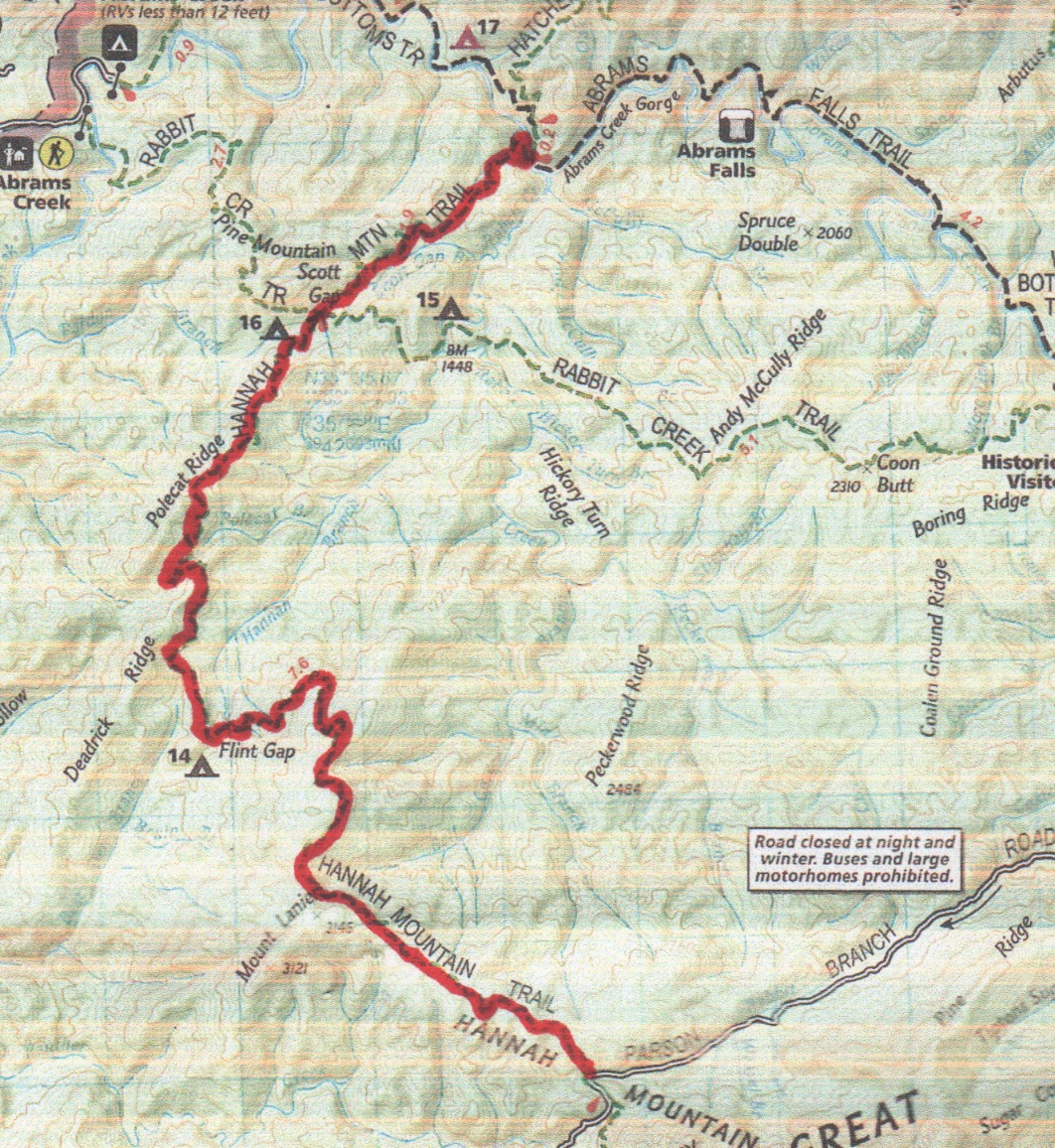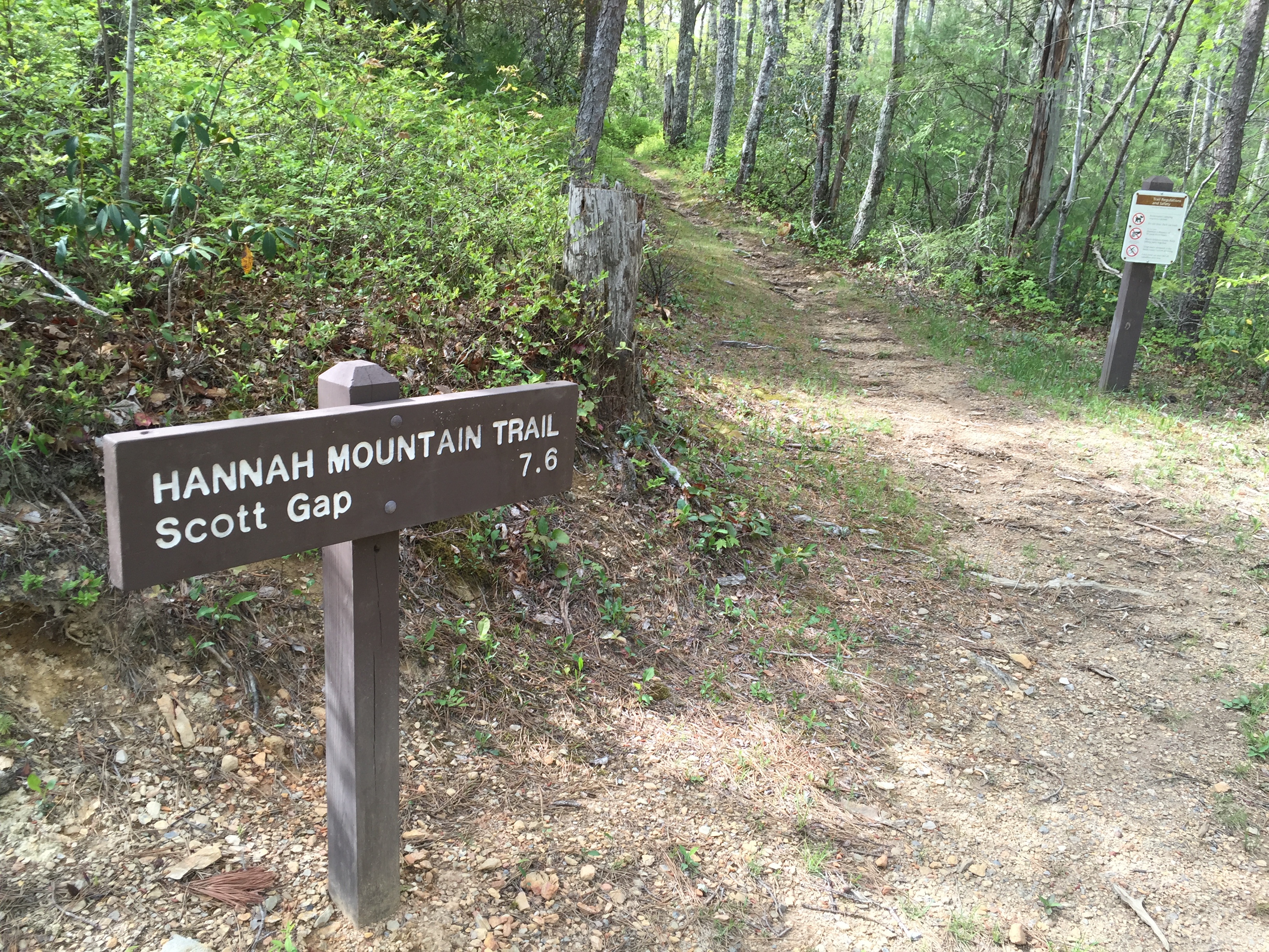 Hannah Cabin, which is unique for it’s brick chimney. Just 0.2 miles past Hannah Cabin is the Long Bunk Trail intersection. From there it’s a mile to NC 284. I took a brief water and granola bar break at the road. 900 Miler purists will note that I did hike the mile out and then back to Long Bunk Trail rather than call it even, but that ethical decision added two of the miles I failed to calculate in the afternoon mileage. This trailhead was the second choice for starting the loop and would have only required a 7.8 mile hike to Mt. Sterling. In retrospect, it would have been a better choice for this loop.