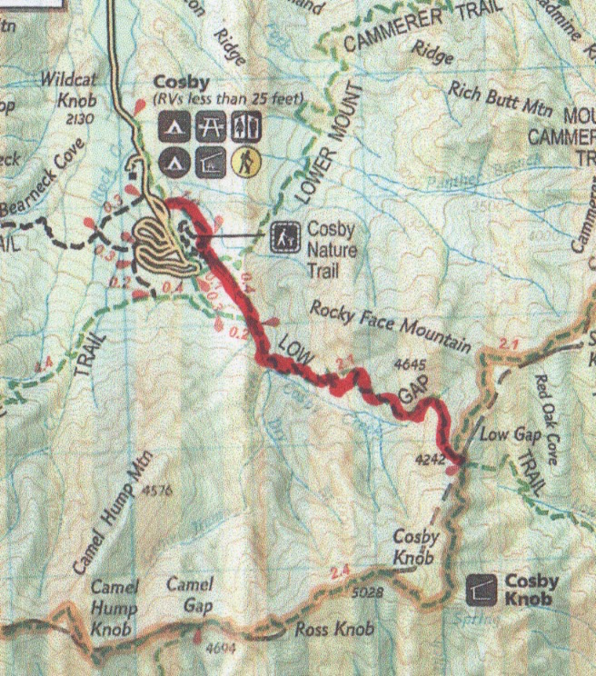 Having completed the first loop of my backpacking trip, I enjoyed some lunch while catching glimpses of elk at the edge of the trees in Cataloochee Valley. Plus, I had to dry out my shoes, not to mention my feet pickled by the miry swamp that was the Caldwell Fork Trail. For this loop, there were three entry points depending on how much hiking I wanted to do the second half of the day. I did a quick check of the mileage if I stayed in Cataloochee and started up Pretty Hollow Gap, taking Little Cataloochee Trail to Long Bunk and then up Mt Sterling Trail. With about 7 miles done in the morning, I figured another 10 or so would get me to the top of Mt. Sterling and CS# 38. Not only did I miscalculate the mileage by about 4 miles short, I also failed to realize the magnitude of the 13.7 mile climb that was in store for me that afternoon. Pretty Hollow Gap leaves Cataloochee Road at 2,717 feet and the day ended at the top of Mt. Sterling at 5,840. Overall, it was a 21.4 mile day and a 3,823 ft. climb ending in a 12% grade up Mt. Sterling Trail.