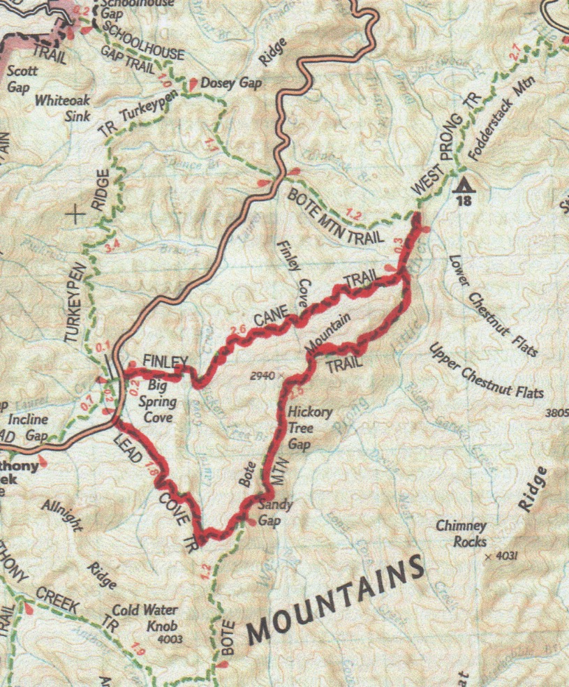 The trail climbs steadily along it’s length. At 0.4 miles it crosses Sugar Grove Prong on an easy rock hopper. Just past Sugar Grove Creek, there are clearings where once stood the Gibson-Tipton Cabin. The next creek crossing is at 1.4 miles over Laurel Cove Creek. The steady climb continues up the flank of Bote Mountain until you reach Sandy Gap at 1.8 miles and the terminus at Bote Mountain Trail.